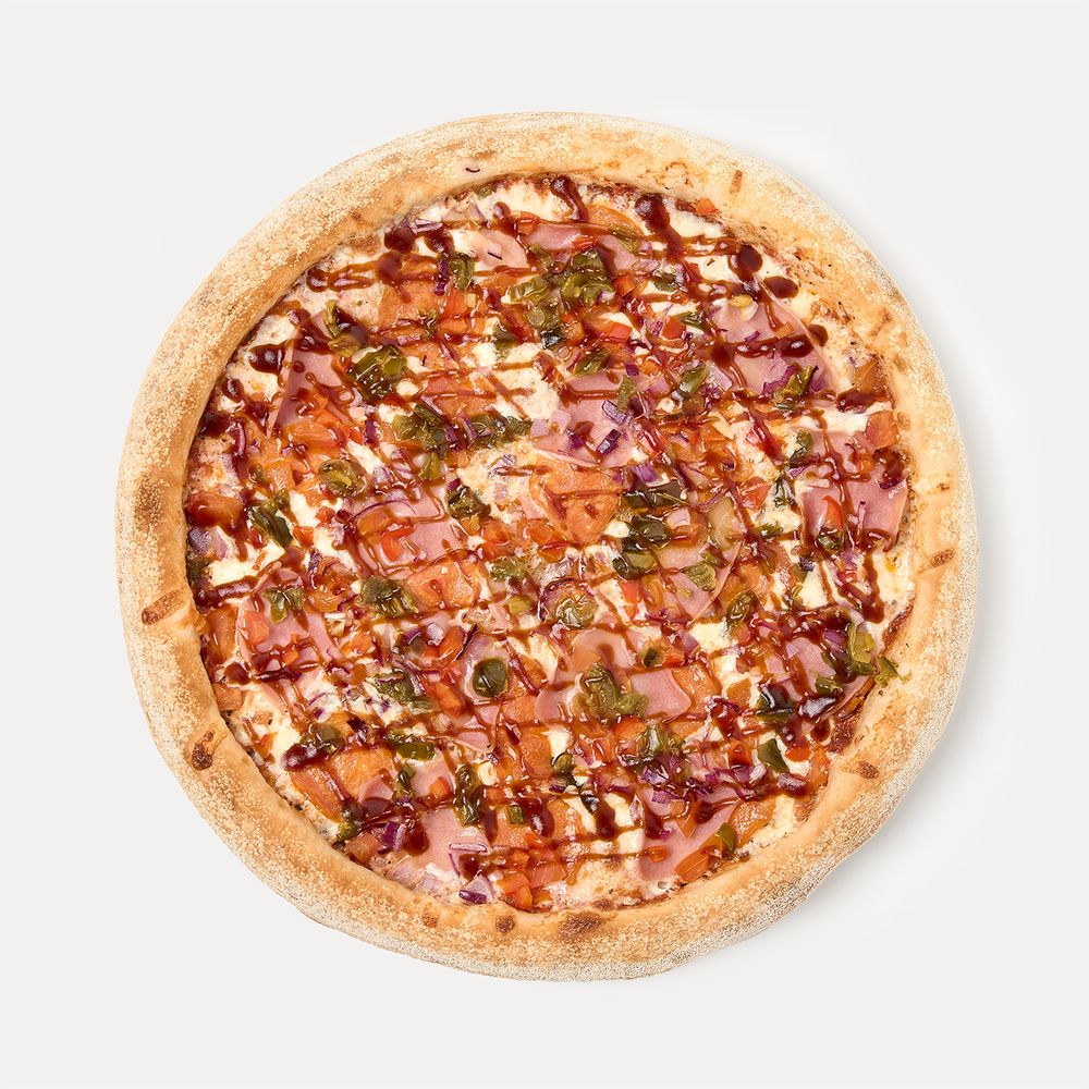 Томатный соус, сыр моцарелла, пепперони, ветчина, болгарский перец, помидоры, лук красный, перец халапеньо, соус барбекю